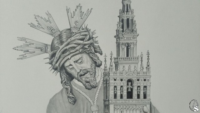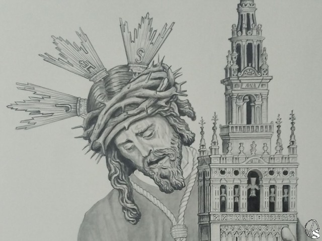 Usando grafito sobre papel canson crema de 50x65 cm, el artista ha querido simbolizar la protección del señor sobre Sevilla y sus habitantes. Uniendo dos obras de arte asociadas intrínsecamente a la esencia de nuestra ciudad, la universal Giralda y Jesús del Gran Poder, una de las mayores devociones no solo de nuestra ciudad, sino también de España y gran parte de iberoamérica.