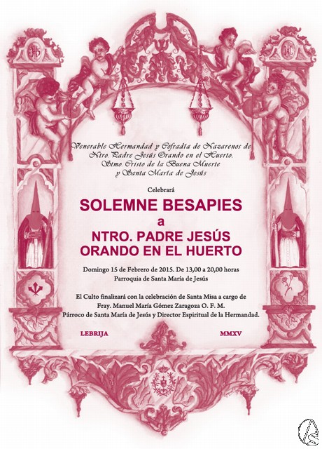 Hdad. Oración en el Huerto. La Junta de Oficiales de la Venerable Hermandad y Cofradía de Nazarenos de Nuestro Padre Jesús Orando en el Huerto, Santísimo Cristo de la Buena Muerte y Santa María de Jesús, informa de la celebración del Solemne Besapiés a nuestro Titular, Nuestro Padre Jesús Orando en el Huerto.