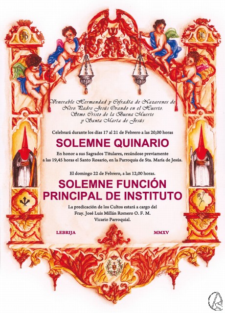 Asimismo les informamos de la celebración del Solemne Quinario en honor de Nuestros Sagrados Titulares a celebrar en la misma Parroquia desde el día 17 hasta el 21 de febrero a las 20.00 horas, siendo la Función Principal de Instituto el Domingo 22 de febrero a las 12.00 horas.