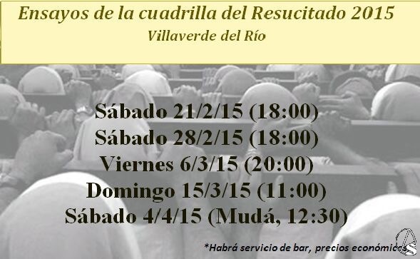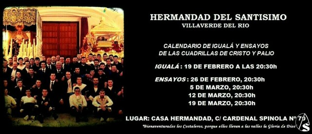Hdad. del Santísimo. La Muy Antigua, Fervorosa y Franciscana Hermandad Sacramental y Cofradía de Nazarenos del Santísimo Cristo de la Vera Cruz, Santo Entierro y Resurrección de Nuestro Señor Jesucristo, y María Santísima de los Dolores en su Soledad, de Villaverde del Río ha establecido los siguientes días de ensayo para sus costaleros: