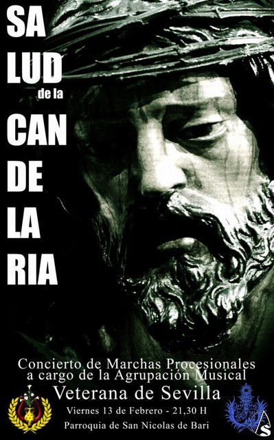 Arte Sacro. Hoy viernes 13 de febrero a las 21,30 horas la Agrupación musical Veterana de Sevilla ofrecerá un concierto de marchas procesionales en la parroquia de San Nicolás de Bari, sede canónica de la Ilustre y Fervorosa Hermandad Sacramental de Nuestro Padre Jesús de la Salud, María Santísima de la Candelaria, Nuestra Señora del Subterráneo y Señor San Nicolás de Bari.