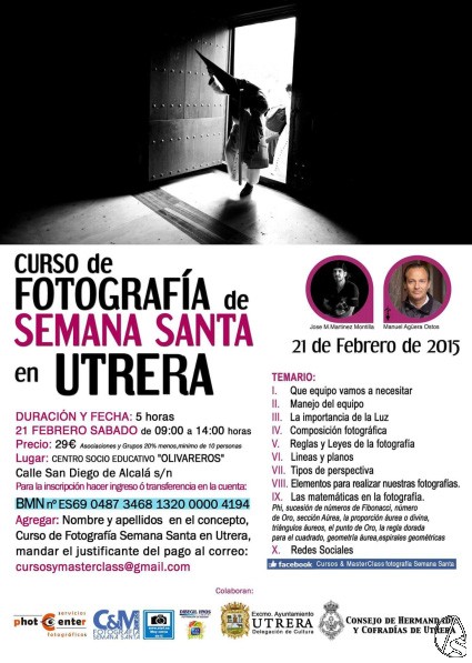 Fran Granado. Utrera acoge el próximo 21 de Febrero la Primera Edición del Curso de Fotografía de Semana Santa en ésta localidad, que tendrá lugar de 9.00 a 14.00h, en el Centro Socio Educativo Olivareros y que cuenta con la colaboración de la Delegación de Cultura del Excmo. Ayuntamiento de Utrera y el Consejo de Hermandades y Cofradías de esta localidad sevillana. Impartido por los fotógrafos José M. Martínez Montilla y Manuel Agüera Ostos, el curso aborda un interesante temario en el que se tratarán cuestiones como el equipo que se requiere para la fotografía de Semana Santa y su manejo, la importancia de la luz y de la composición, los tipos de planos y de perspectiva o la difusión a través de las redes sociales, entre otras.