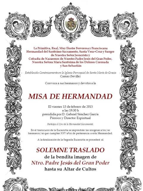 Arte Sacro. La Primitiva, Real, Muy Ilustre, Fervorosa y Franciscana Hermandad del Santísimo Sacramento, Santa Vera+Cruz y Sangre de Nuestro Señor Jesucristo y Cofradía de Nazarenos de Nuestro Padre Jesús del Gran Poder, Nuestra Señora María Santísima de los Dolores Coronada y San Sebastián, convoca a todos sus hermanos y devotos a la Misa de Hermandad que se celebrará el próximo viernes 13 de febrero a las 19:30 en la Iglesia Parroquial de Santa María de Gracia.