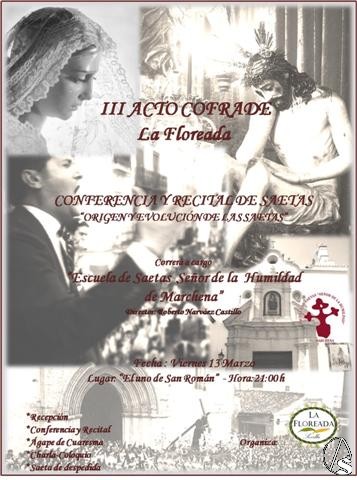 Este año han decidido realizar una conferencia y recital de Saetas bajo el título "Origen y evolución de las saetas", que correrá a cargo de la Escuela de Saetas Señor de la Humildad, de Marchena.