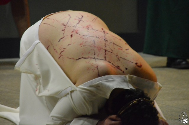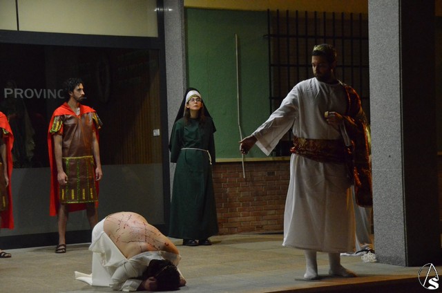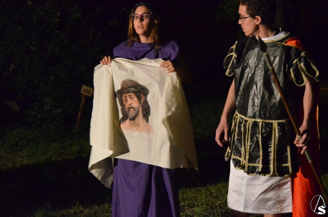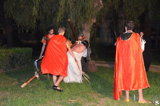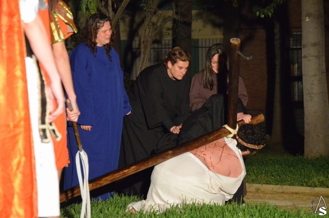 Este vía crucis tiene la peculiaridad que cada una de las 14 estaciones esta escenificada por el Grupo de Teatro “Tocando el Cielo” que por tercer año consecutivo se enfrenta al entrañable reto de representar la Pasión de Cristo cambiando las catorce cartelas representativas por catorce escenas de teatro.