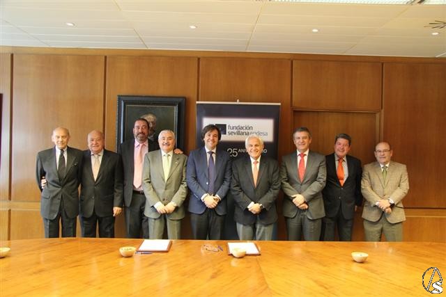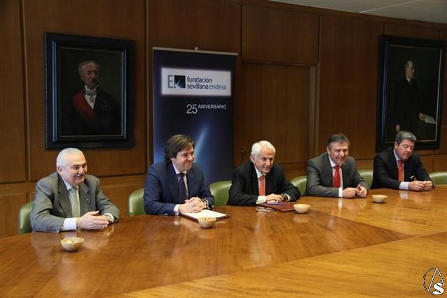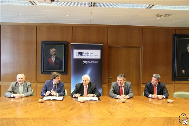 Fotos: De izquierda a derecha: Carlos Bourrellier, presidente del Consejo General de Hermandades y Cofradías de la Ciudad de Sevilla, José Antonio Moncayo, hermano mayor de la Hermandad de la Redención, Antonio Pascual, presidente de la Fundación Sevillana Endesa, Francisco Arteaga, director general de la Fundación Sevillana Endesa, y Jesús García, director de la Fundación Sevillana Endesa.