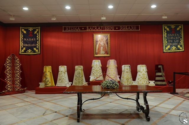 El contenido está distribuido en los dos salones de exposición y en el patio central, donde se contempla el magnífico altar de cultos del S. XVII que la Hermandad conserva en perfecto estado. También por primera vez se expone tras su restauración la saya que Rodríguez Ojeda hiciera para la Virgen del Rosario en 1925, los mantos de salida, insignias, el cartel conmemorativo del IV Centenario realizado por Luís Rizo y otros objetos que nos acercaran a la historia cuatro veces centenaria de esta corporación aljarafeña que tiene como titular a la Virgen del Rosario.