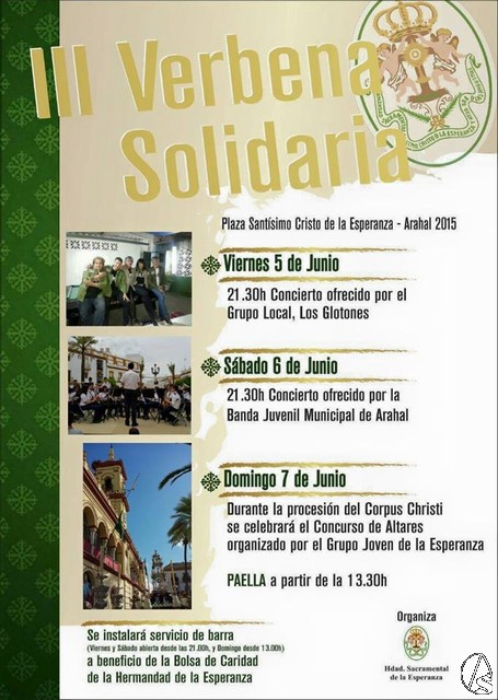 Se instalará servicio de barra durante el viernes y sábado estará abierto el servicio desde las 21:00 horas y el domingo desde las 13:00, los beneficios irán destinados a la Bolsa de Caridad de la Hermandad de La Esperanza de Arahal.