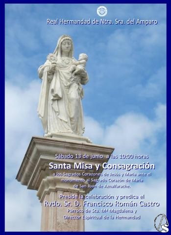 Arte Sacro. Hoy, sábado día 13 de junio, fiesta del Inmaculado Corazón de María, la Real, Venerable e Ilustre Hermandad de Nuestra Señora del Amparo celebrará santa misa a las 10 horas en la explanada baja del Monumento a los Sagrados Corazones de San Juan de Aznalfarache, ante la imagen del Inmaculado Corazón de María, réplica de la Santísima Virgen del Amparo. Se concluirá con la renovación de la consagración a los Sagrados Corazones. La santa misa estará presidida por el cura párroco y director espiritual de la hermandad, Francisco Román Castro.