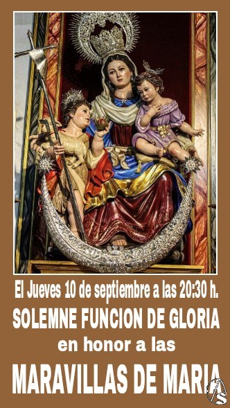 Arte Sacro. El jueves, 10 de septiembre, a las 20,30 horas, celebra la Hermandad del Carmen Doloroso, solemne función de gloria en honor a las Maravillas de María con motivo de su festividad litúrgica. Ocupará la sagrada cátedra Pedro Juan Álvarez Barrera, párroco de Omnium Sanctorum y director espiritual de la hermandad.
