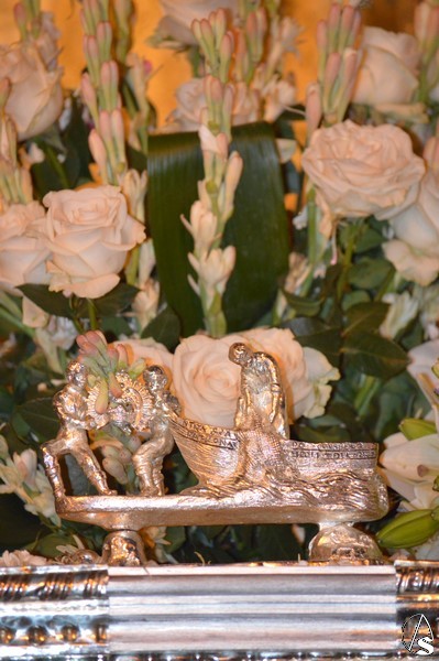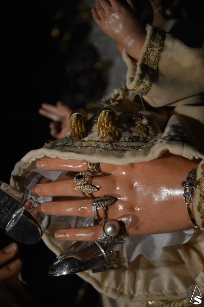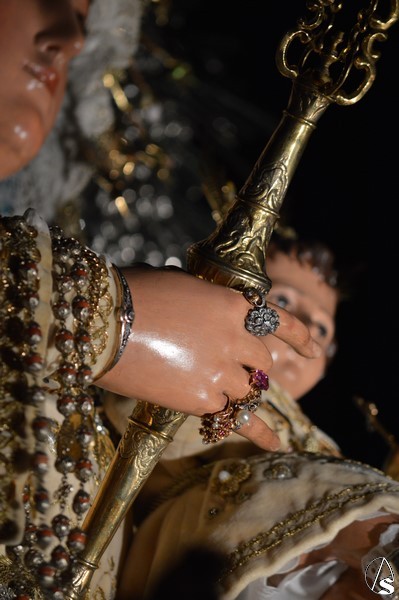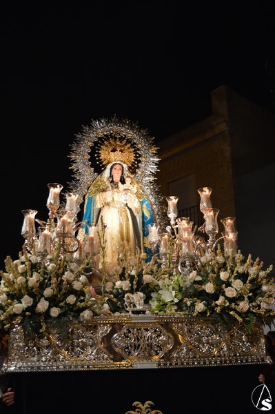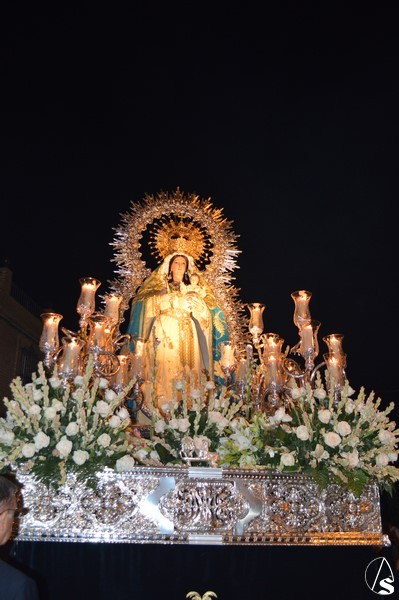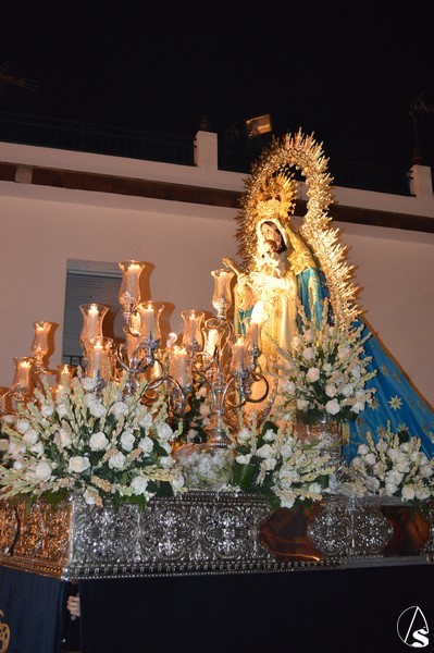 Nuestra Señora del Consuelo, obra de Antonio Castillo Lastrucci, procesiona sobre paso con respiraderos de plata y alumbrada con candelabros de guardabrisas, hasta hace unos años era portada a hombros por fuera. El exorno floral estaba compuesto de nardos y rosas blancas. Los sones de la Banda Santa Ana de Dos Hermanas acompañaron a la Santísima Virgen que lució saya de tonos claros bordada y manto de tono turquesa bordado. En su mano derecha porta cetro de oro, mientras que en su mano izquierda sostiene al Santísimo Niño que lució túnica de tonos claros bordada. Sobre sus sienes sostiene corona dorado quedando enmarcaba en ráfaga de metal plateado.