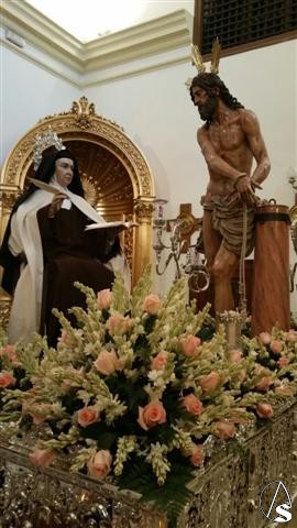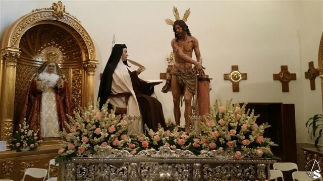 Arte Sacro. Siguiendo el estilo del paso que procesionó en la víspera del Corpus de Sevilla, se ha recreado el encuentro de la Santa con el "Cristo muy llagado" que nos cuenta ella misma en el capítulo 9 del libro de la Vida.