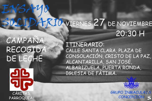 Fran Granado. Hoy viernes 27 de Noviembre a partir de las 20:30 tendrá lugar el Ensayo Solidario organizado por el Grupo de la Inmaculada Concepción con el siguiente itinerario: