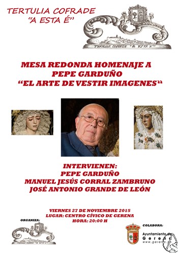 Fran Granado. La Tertulia Cofrade "A Esta É" de Gerena, organiza una Mesa Redonda como homenaje a Pepe Garduño, bajo el título "El arte de vestir a las imágenes". Estarán en ella los contertulios, José Antonio Grande de León, Manuel Jesús Corral Zambruno y el propio José Garduño Navas. El acto será presentado por la presidenta de la tertulia, Pregonera de la Semana Santa de Gerena 2016, Soledad Núñez Acuña, y la moderación del debate correrá por cuenta del Concejal Delegado de Cultura del Ayuntamiento de Gerena, Juan Manuel Illacucci Fernández.