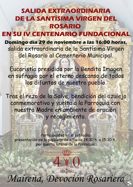 Fran Granado. El próximo domingo día 29 de noviembre de 2015 a las 16:00 horas tendrá lugar la salida extraordinaria de Nuestra Señora del Rosario de Mairena del Aljarafe, que por primera vez visitará el Cementerio Municipal conmemorando el IV Centenario Fundacional de esta Hermandad. La Cofradía estará organizada por tramos en el que participarán gran número de Hermanos con su papeleta de sitio y organizada por sexo, de tal manera que las mujeres irán delante de la virgen y por orden de antigüedad y los hombres de igual manera por detrás del paso. Una vez lleguemos al Cementerio celebraremos una Eucaristía en la que