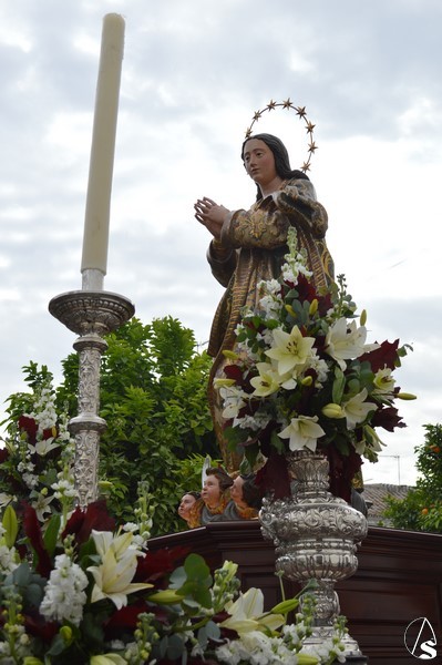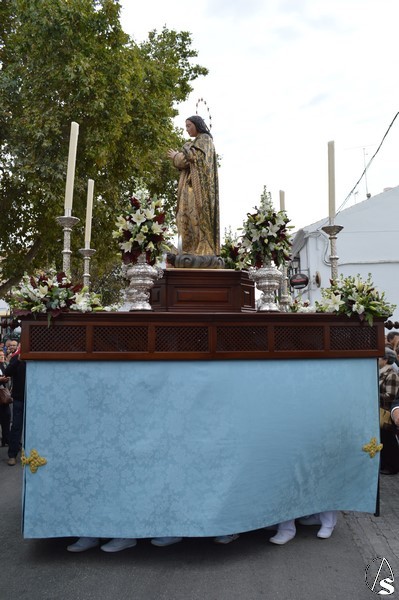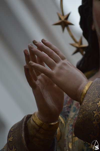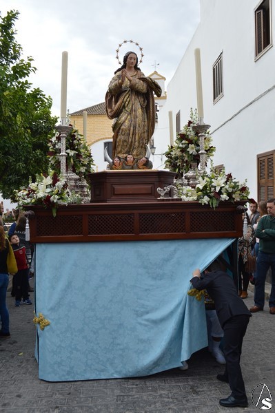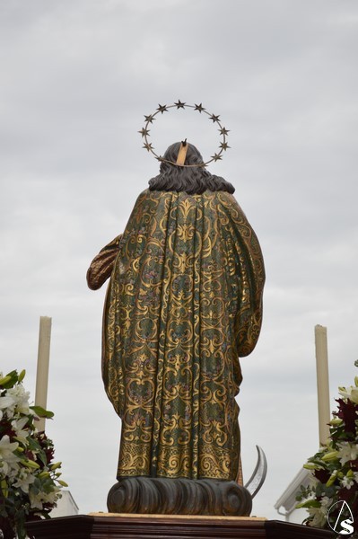La imagen inmaculista procesionó sobre sencillo paso de madera, estando alumbrada por candeleros de plata en las esquinas. Un pequeño capataz, cuyo llamador se encontraba en las parihuelas, guiaba a los costaleros por las bellas calles de la Villa Ducal de Osuna.