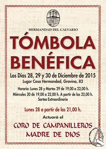 Arte Sacro. Durante los días 28 al 30 de diciembre la Hermandad del Calvario celebrará su tradicional “Tómbola Benéfica”, que tendrá lugar, como en años anteriores, en la casa de hermandad en la c/ Gravina nº 82, en horario de 19 a 22 horas, destinándose lo recaudado a sufragar las obras asistenciales.