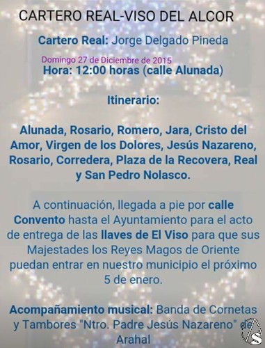 Fran Granado. Este año el Cartero Real en El Viso del Alcor lo encarnará Jorge Delgado Pineda. El Cortejo empezará a las 12:00 horas de la Calle Alunada con el siguiente itinerario: