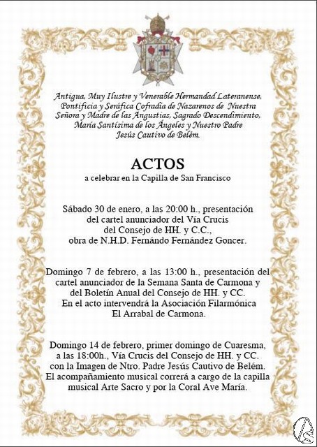 El domingo 7 de febrero, a las 13:00 horas, en el mismo lugar, se presentará el cartel de la Semana Santa de Carmona y del boletín anual del Consejo de HH. y CC. de la ciudad con la intervención de la Asociación Filarmónica El Arrabal, de Carmona.