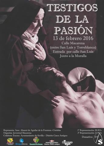 La obra que –en ediciones anteriores– ha cosechado un rotundo éxito, en esta ocasión y, gracias a la colaboración del Ayuntamiento de Sevilla – Distrito Casco Antiguo, será puesta en escena en la c/ Macarena, en la zona comprendida entre San Luis y Torreblanca. Un espacio escénico con un aforo máximo de 200 personas por sesión. En esta cita, propia del Tiempo Litúrgico de la Cuaresma, se escenificará la Pasión y Muerte de Jesús, bajo el incomparable telón de fondo de la muralla de la Macarena.