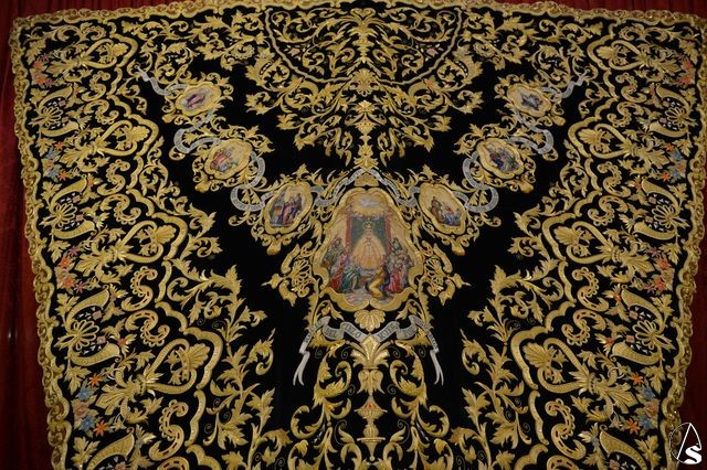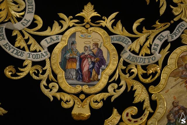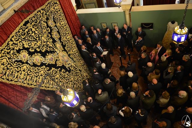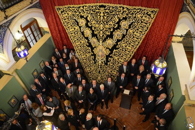 Daniel García Acevedo. El pasado viernes 5 de febrero, en el patio del Círculo Mercantil, tuvo lugar la inauguración de la exposición que conmemora los diez años de historia de Círculo de Pasión, con el estreno del nuevo manto para la Virgen del Rocío, como pieza estrella. En manto que podremos ver el próximo Lunes Santo y que ha salido del taller de bordados Santa Bárbara.