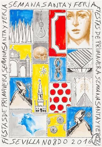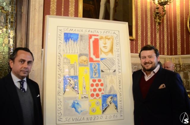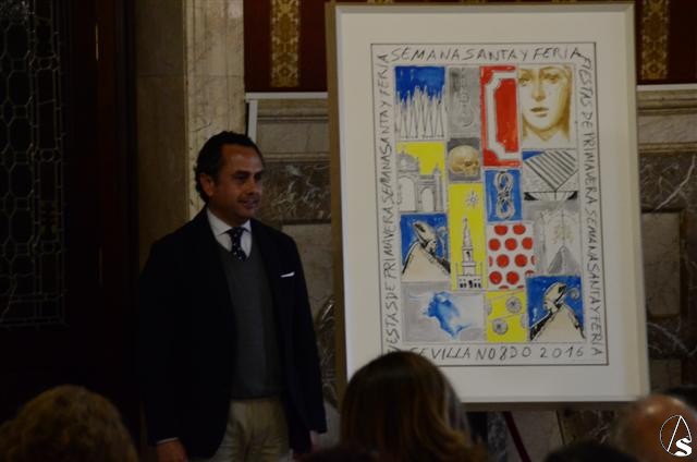 Arte Sacro. El Ayuntamiento de Sevilla ha presentado ayer, lunes 8 de febrero, el cartel de las Fiestas de Primavera de 2016. Se trata de una obra cargada de simbolismo y realizada en acuarela y lápiz graso sobre papel por el pintor y escultor Ricardo Suárez, artista que posee una amplia trayectoria como cartelista.