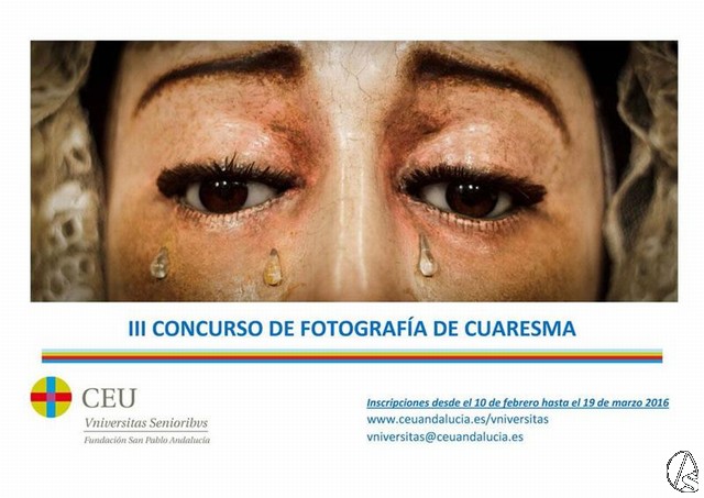 Se convoca el III concurso de fotografía de Cuaresma – CEU Sevilla, con objeto manifestar el sentido último de los diversos momentos de culto, relaciones de hermandad, oficios vinculados con la artesanía cofrade, ensayos de cuadrillas de costaleros, de bandas musicales, gastronomía y todos aquellos momentos que tengan alguna relación con la vida y las costumbres del tiempo de Cuaresma, quedan excluidas las fotografías referidas a las salidas procesionales en Semana Santa.