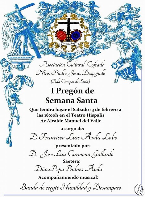 Arte Sacro. Hoy Sábado, 13 de Febrero 2016, a las 18:00 Horas, tendrá lugar en el Teatro Híspalis el I Pregón de Semana Santa organizado por la Asociación Cultural Cofrade Nuestro Padre Jesús Despojado.