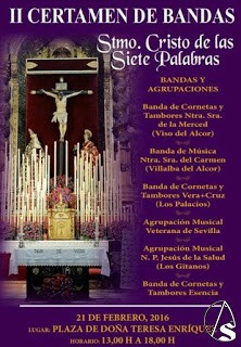 Arte Sacro. El domingo 21 de febrero en la Plaza de Doña Teresa Enriquez, la Hermandad Sacramental de las Siete Palabras celebrará la segunda edición del certamen de bandas “Santísimo Cristo de las Siete Palabras”.