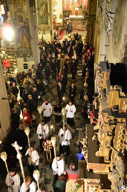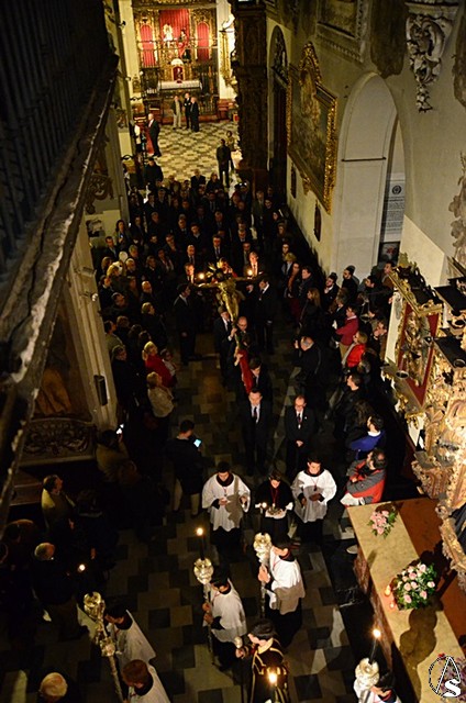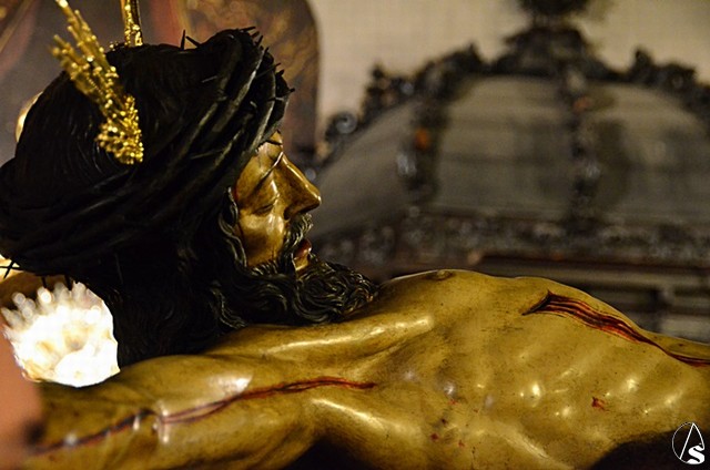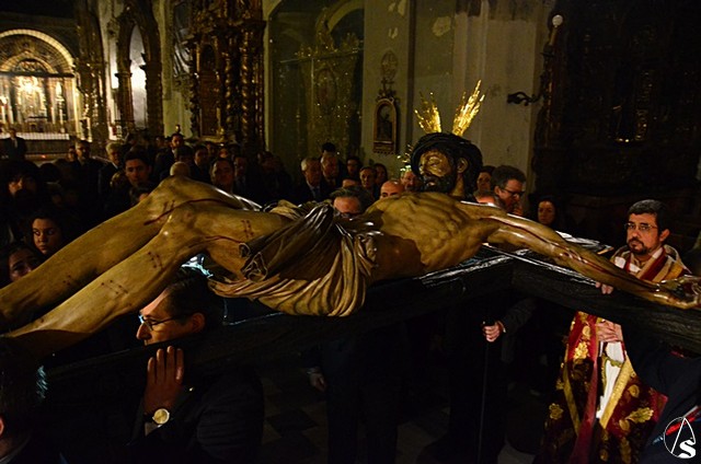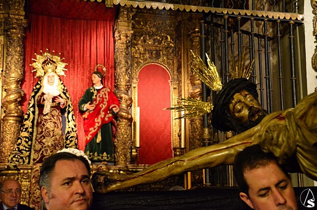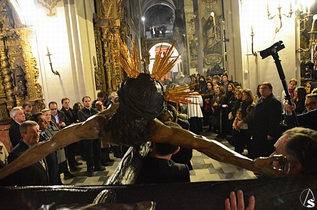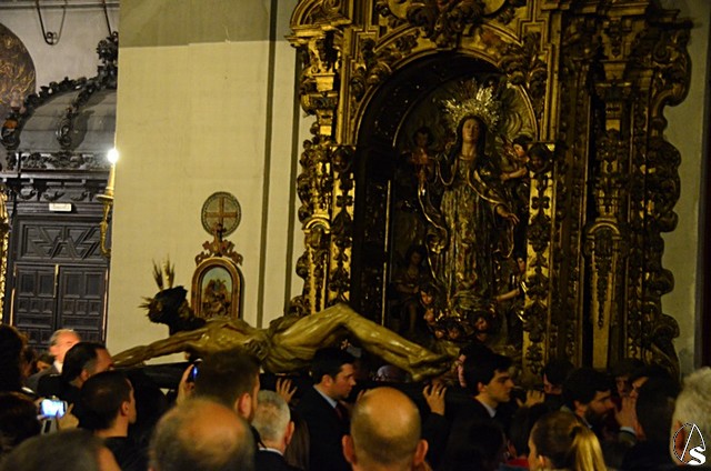 La imagen del Señor transitó por las naves del templo en un traslado de una hora de duración donde hizo tres paradas; en la capilla sacramental, a la altura del coro y en el altar de Ánimas, antes de alcanzar el retablo mayor, donde ya estaba instalada la estructura del quinario que comenzará el próximo martes.