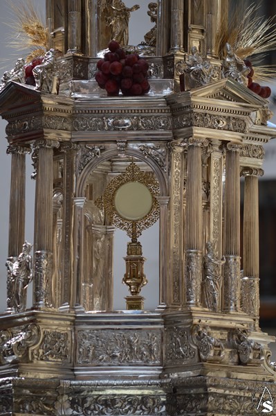 Francisco de Alfaro, uno de los artistas más grandes en la historia de la orfebrería sevillana, manifiesta en esta custodia un programa iconográfico, relacionado con la Eucaristía; en la primera planta se presenta el anuncio de este misterio, en la segunda la entrega del Cuerpo de Cristo, y en la tercera la resurrección de la carne. Este programa iconográfico fue cambiado, al pasar el Santísimo de la segunda a la primera planta de la custodia, en el siglo XVIII, y colocarlo en un ostensorio, con un viril de oro y piedras preciosas.
