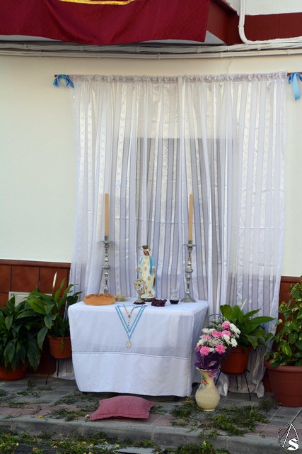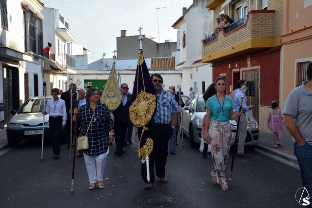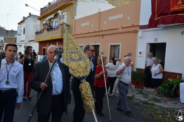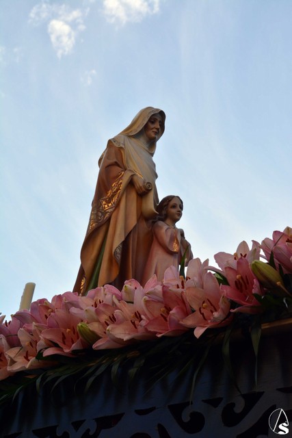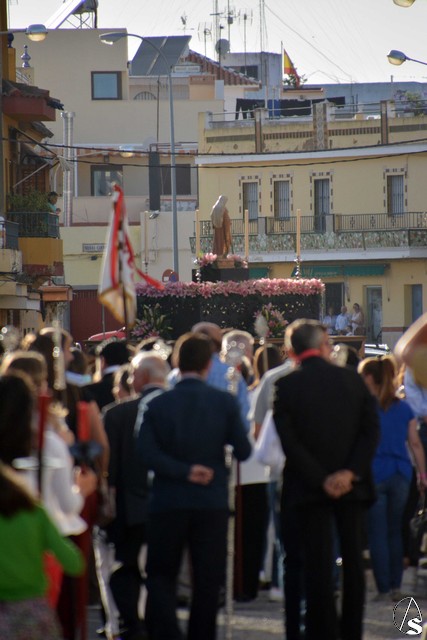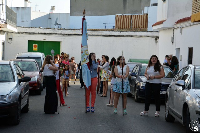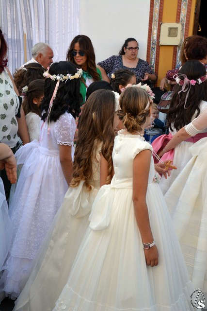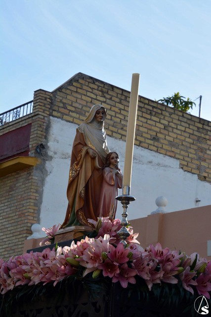 Abría el cortejo la Banda Juvenil del Santísimo Cristo de las Tres Caídas de Triana y tras la Cruz Parroquial iban los niños que está recibiendo la catequesis, acompañados de sus catequistas. Detrás del paso de Santa Ana, muchos de los niños y niñas que han hecho la primera comunión este año en la parroquia (nos informaba el párroco, D. Rafael Fiol, que, en total y entre los diferentes turnos, han sido unos cuatrocientos) vestidos con sus trajes de comunión y que formaban un alegre cortejo.