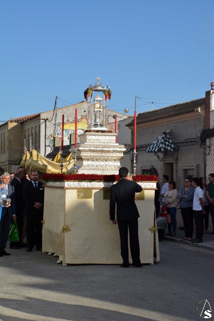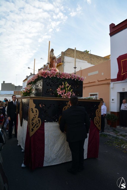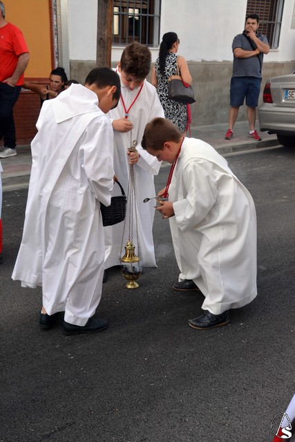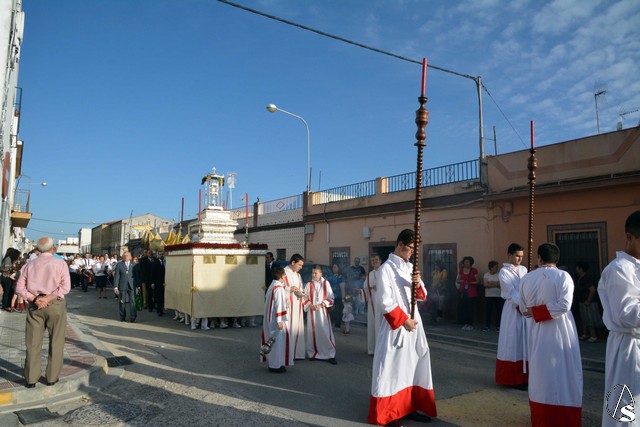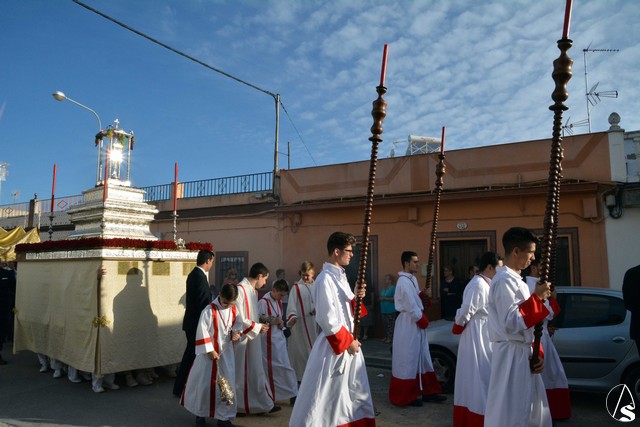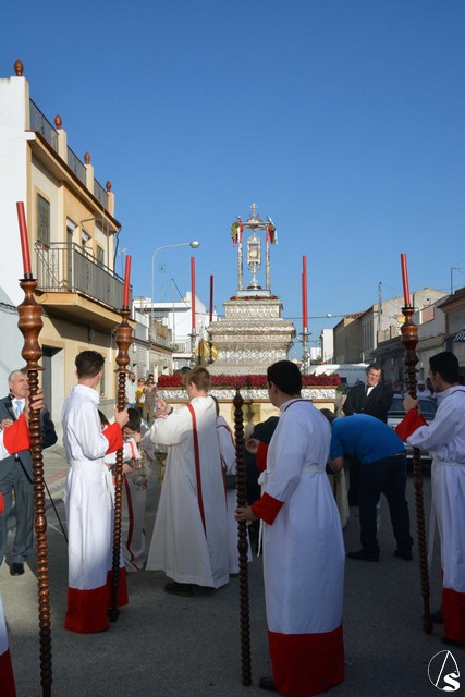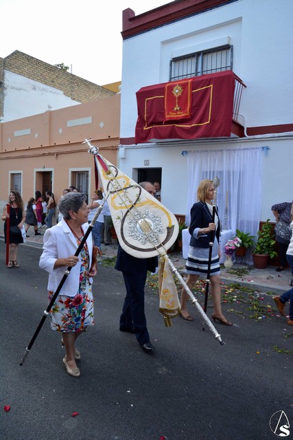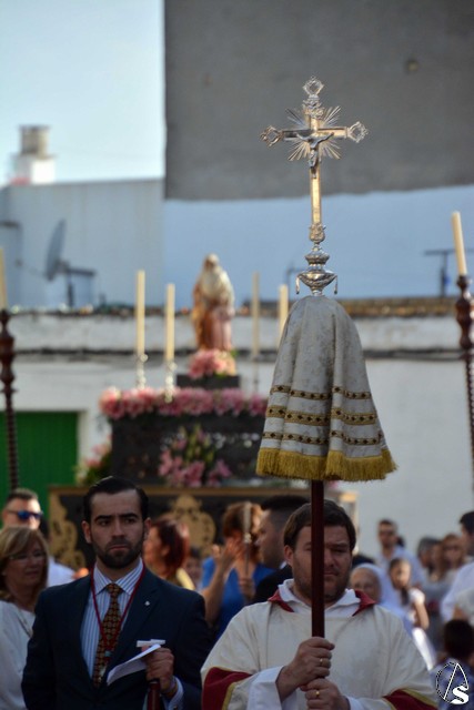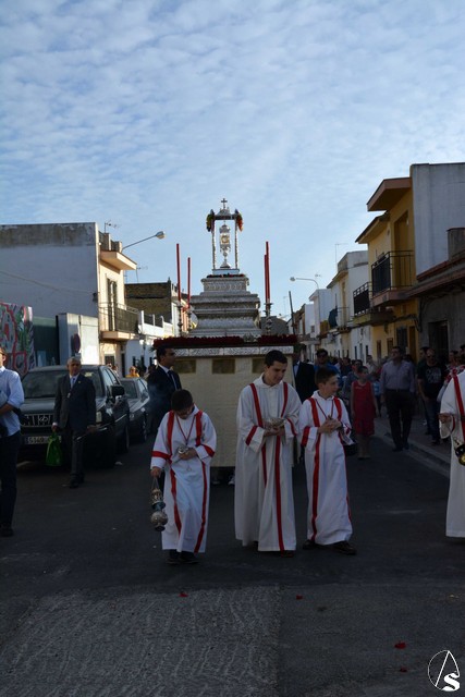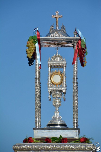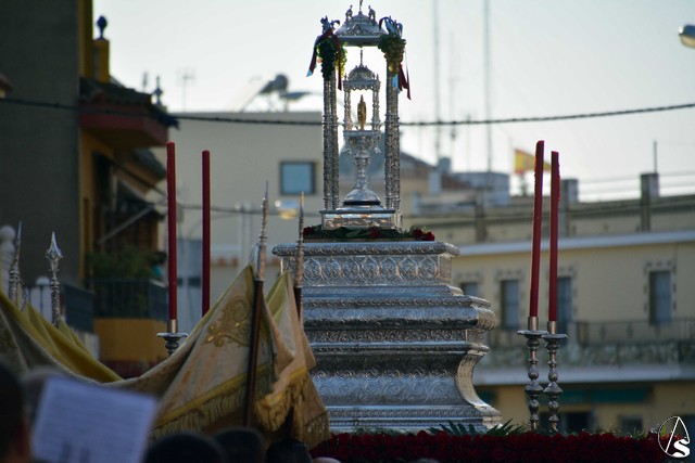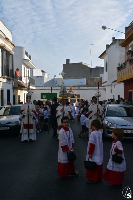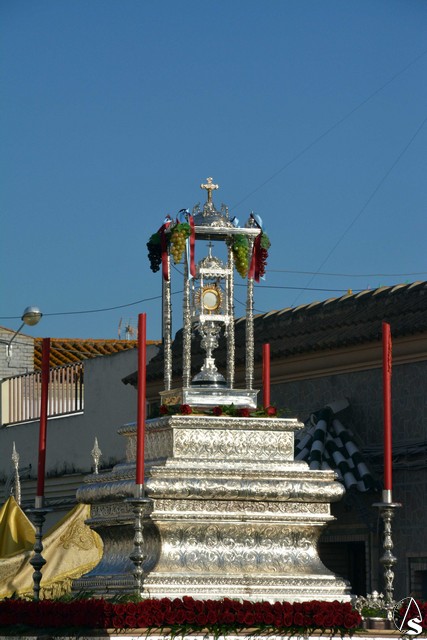Luis M. Fernández. En la tarde de ayer jueves, la Agrupación Parroquial del Santísimo Sacramento y Dulce Nombre de Jesús de la Parroquia de la Oliva de Dos Hermanas organizó la procesión del Corpus Christi por las calles de la feligresía. Además del paso con la custodia, cedido por la hermandad de Valme y que estrenaba la primera fase de los respiraderos, realizados en el el taller nazareno "Orfebrería Juan Lozano", figuraba en la procesión un paso con Santa Ana, patrona de los niños de catequesis de la parroquia.