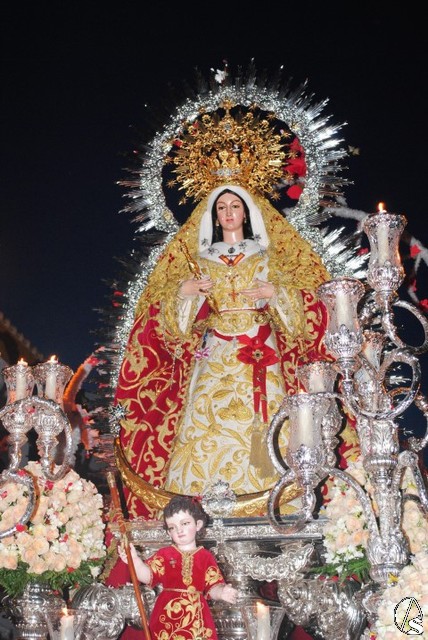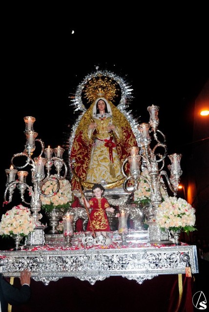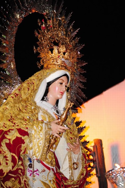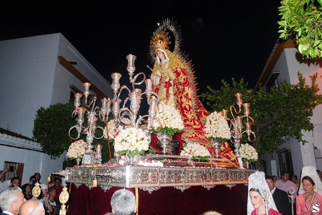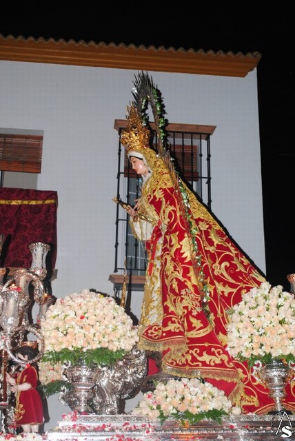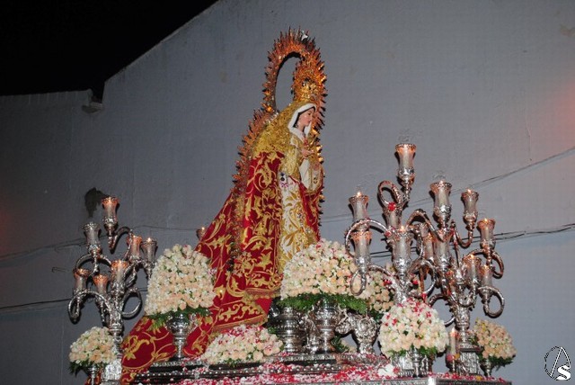 Pasadas las ocho y media de la tarde la Virgen abandona el Templo Parroquial de la Asunción, tras una dificultosa salida debido a la pequeña puerta del Templo.