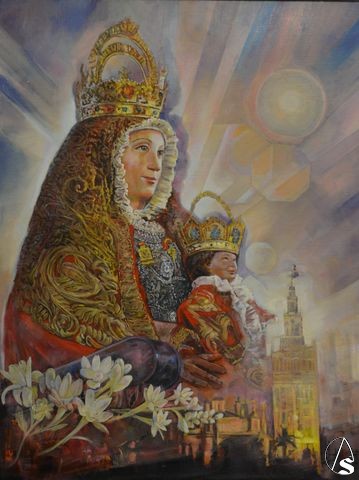 El cartel ha corrido a cargo de Isabel María Castilla Soriano, natural de Valverde del Camino. Se trata de una bella obra donde en la parte izquierda aparece la patrona con el niño, con el manto rojo, de medio perfil, reinando sobre la Catedral y la Giralda y con el primer rayo de luz de la mañana proyectándose en la Virgen.