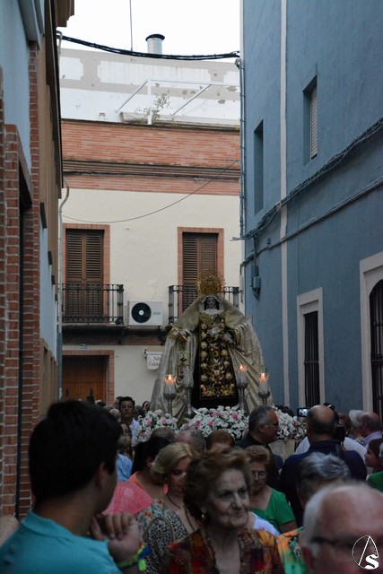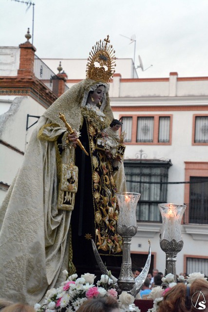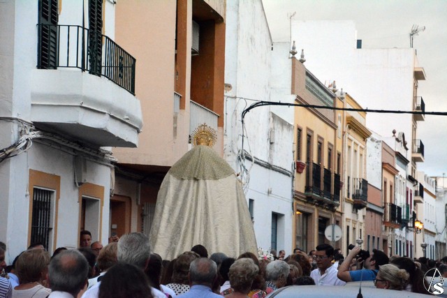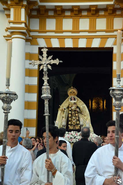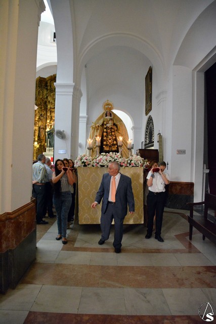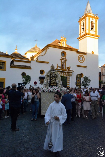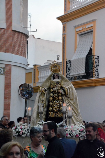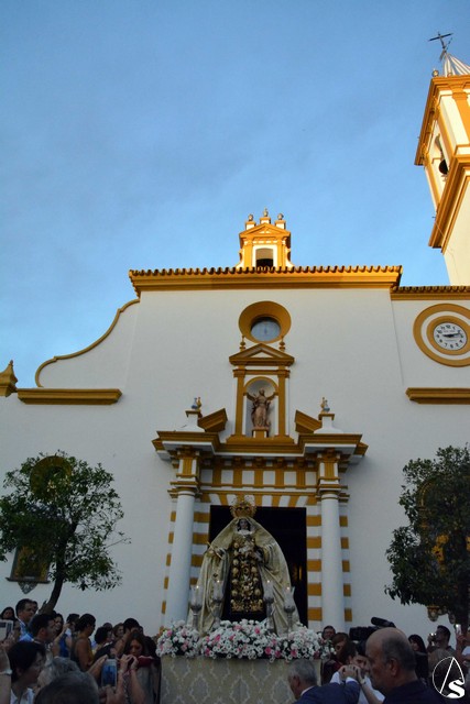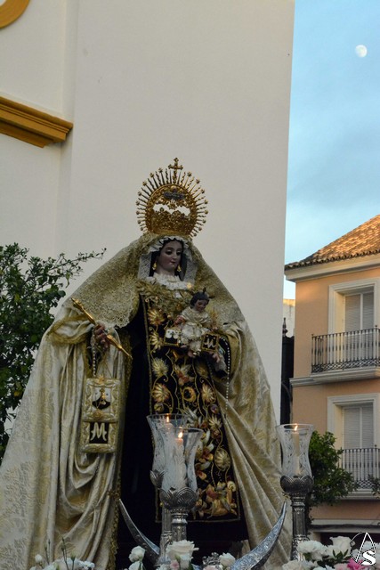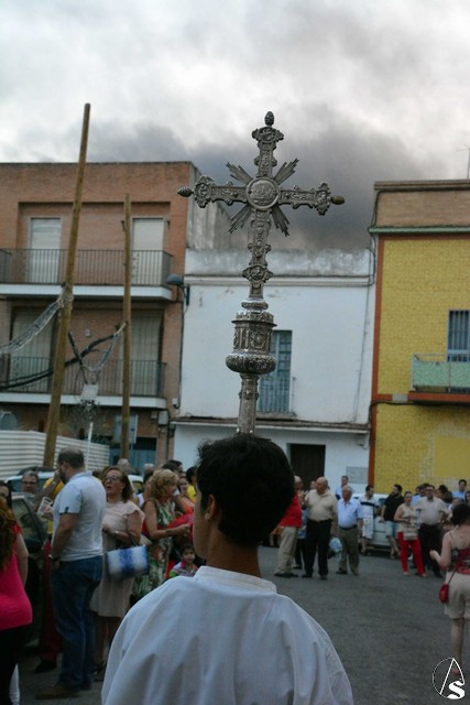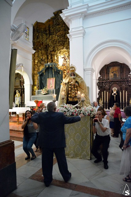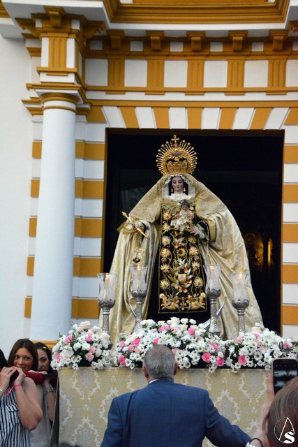 Luis M. Fernández. En una tarde en que parte del cielo de Dos Hermanas se cubrió de un denso humo negro producto de un desgraciado incendio, la Virgen del Carmen de la parroquia nazarena de Santa María Magdalena salió por primera vez a la calle para ser honrada por sus fieles. Después de una Función Principal en la que se llenó el templo, sobre las nueve de la tarde y en andas portadas por sus devotas, la pequeña imagen se asomó bajo el cancel de la iglesia, provocando un fuerte aplauso que casi acalló los sones del himno nacional interpretado por la Banda de Música Santa Ana de Dos Hermanas, encargada del acompañamiento musical.