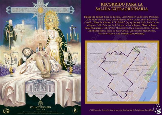 Respecto al paso extraordinario, procesionará el de Nuestro Señor Jesucristo Yacente, obra del orfebre sevillano Ángel Gabella de 1976, plateado, cincelado y repujado en plata, donado por el hermano mayor honorario José Luis Osborne Vázquez. Sobre el mismo, y retirando la urna en la que procesiona Nuestro Señor cada Viernes Santo, un montaje evocador y nunca visto en la ciudad, conformado por la Santa Cruz, Nuestra Madre y Señora de la Soledad y Nuestro Señor Jesucristo Yacente a modo de “Piedad”, rememorando los orígenes de la Hermandad donde el Señor poseía brazos articulados y se celebraba con Él la ceremonia del descendimiento. El montaje lucirá el próximo 27 de agosto como obra culmen de David Calleja, director artístico de la hermandad, que además es vestidor de Nuestra Madre y Señora de la Soledad.