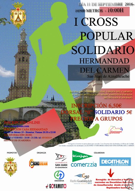 Fran Granado. Tan sólo queda un mes para el Primer Cross Popular Solidario que organiza la Hermandad del Carmen de San Juan de Aznalfarache. Es el primer acontecimiento deportivo que organiza esta corporación, que tras mucho trabajo y esfuerzo va a ser realidad, gracias como no al apoyo de muchos comercios del pueblo, grandes y pequeños, y a las diferentes instituciones, que sin todos ellos no hubiera sido posible.