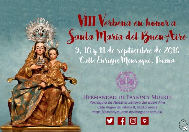 Arte Sacro. La Hermandad de Pasión y Muerte organiza la octava edición de la verbena dedicada a Santa María del Buen Aire, durante los días 9 al 11 de septiembre, que se celebrará en la Casa Hermandad, sita en la calle Enrique Mensaque del barrio de Triana.