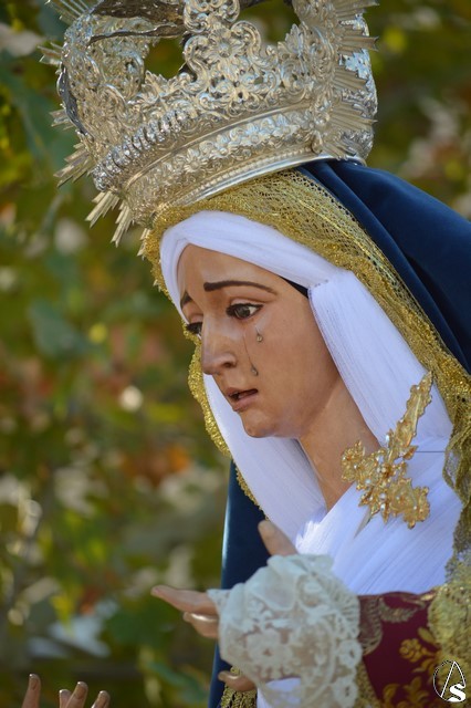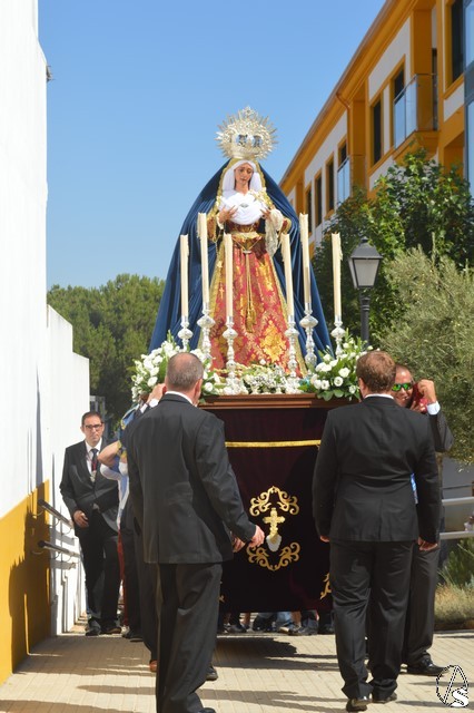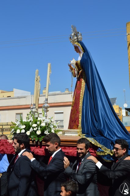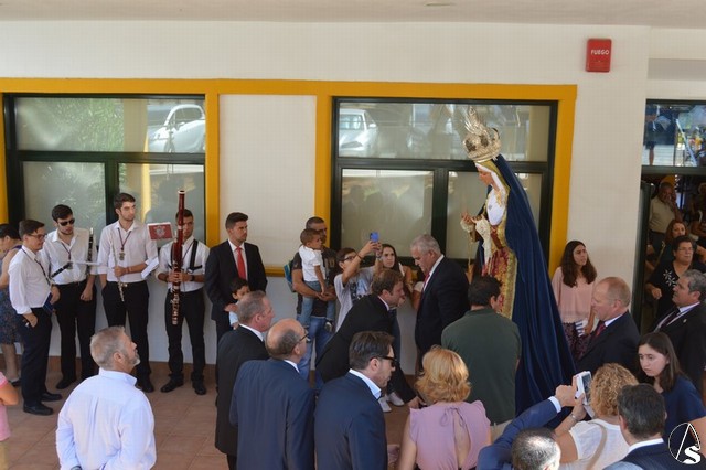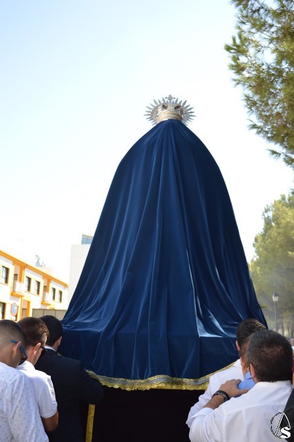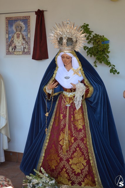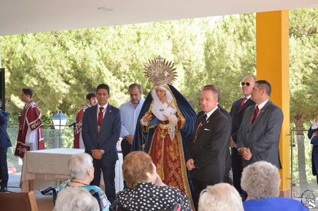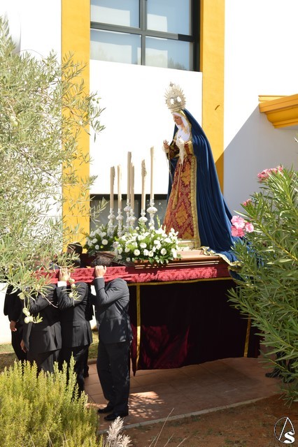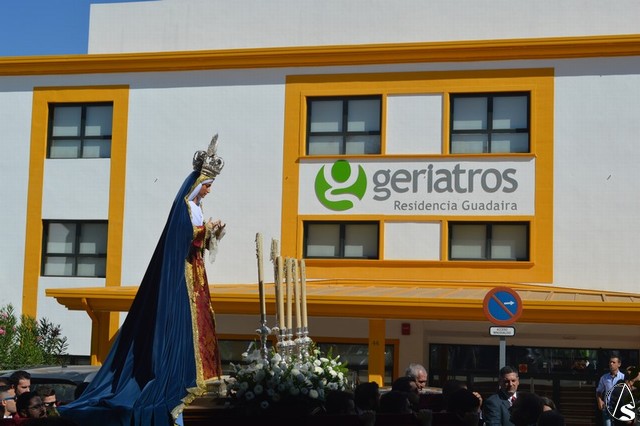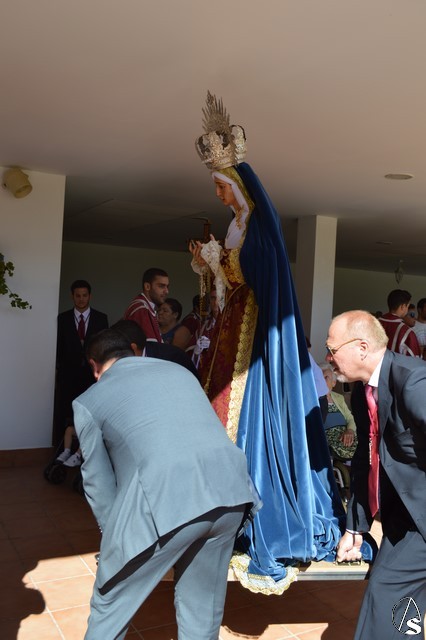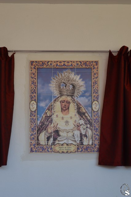 Manuel Pinto Montero. La Virgen de los Ángeles de la Agrupación de la Tercera Palabra de Alcalá de Guadaíra fue trasladada el pasado sábado hasta la Residencia Guadaíra en el barrio alcalareño de La Nocla donde tuvo lugar la Eucaristía en presencia de los residentes. Una vez finalizada la Misa se descubrió un retablo cerámico de la imagen en el patio de la Residencia y se inició el camino de vuelta a la Parroquia de Santa María y San Miguel pasadas las doce del mediodía.