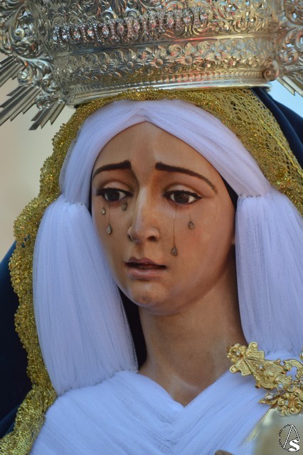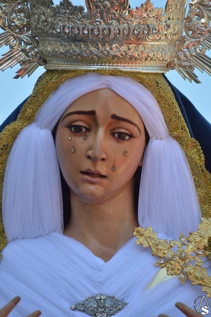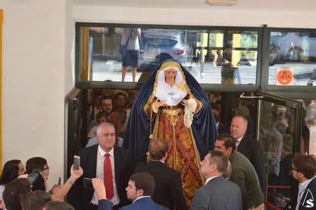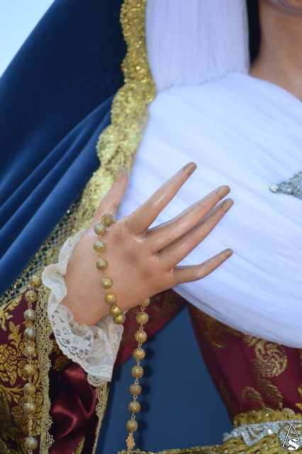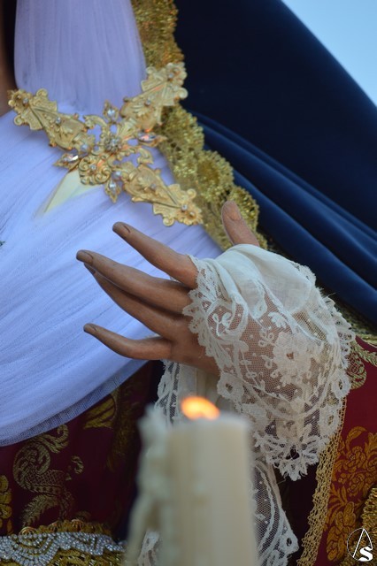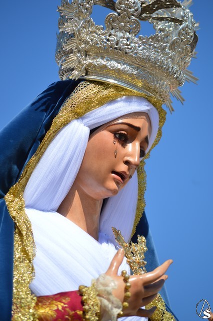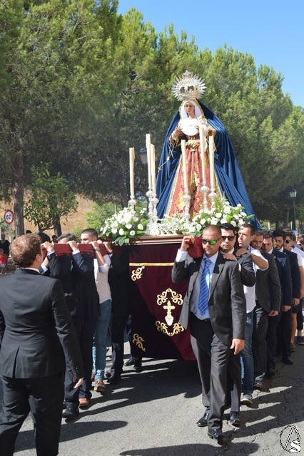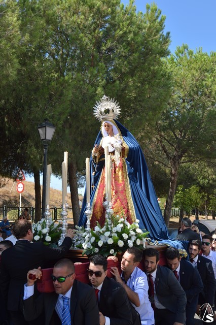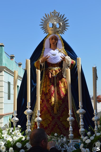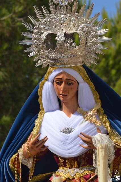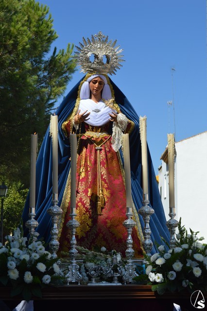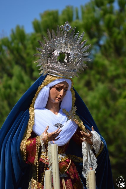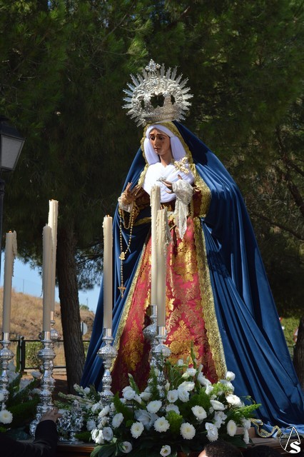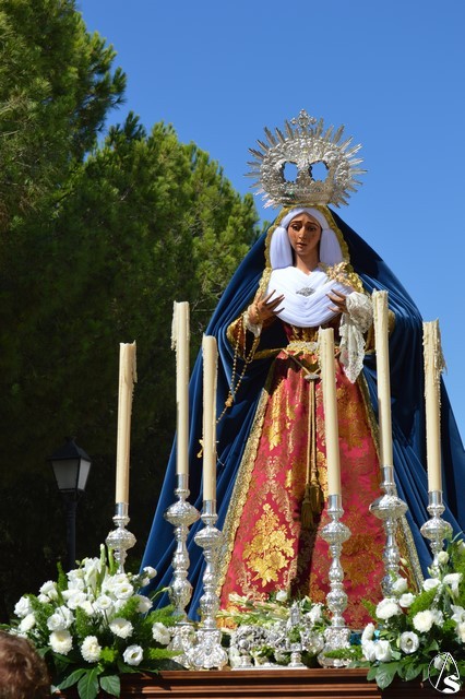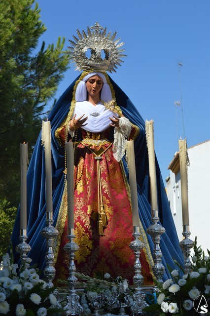 La imagen de Madre de Dios de los Ángeles es obra de Salvador Madroñal del año 1992 que se veneraba en el Convento de Santa Clara hasta que la Agrupación Parroquial le rindió culto en su Templo de Santa María y San Miguel junto al resto de titulares. Para esta ocasión la Virgen de la Ángeles lució saya roja de brocado y manto azul de terciopelo. Sobre su mano derecha sostuvo un rosario mientras que en la izquierda portó un pañuelo blanco. En su pecho lució puñal dorado y en sus sienes corona de plata. La Virgen fue traslada en andas exornadas con flores blancas e iluminada con varios candeleros en la delantera.