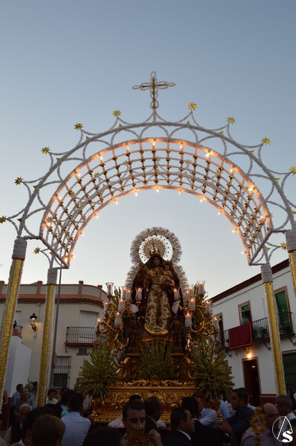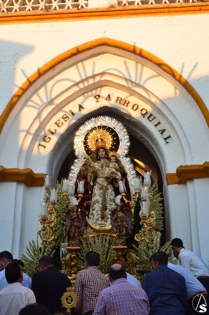 Emocionante y dificultosa es la salida del Templo Parroquial donde numerosos vivas la esperan, así como el estallido de cohetes en las distintas calles del recorrido. Huévar se engalana para este día con arcos en sus calles. Pero sin duda el discurrir de la procesión por la Plaza de España es especialmente bello por los arcos y la cúpula que en honor de la Virgen se coloca en este rincón de Huévar.