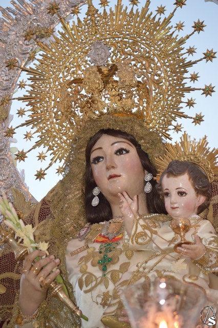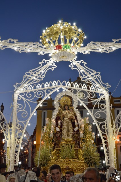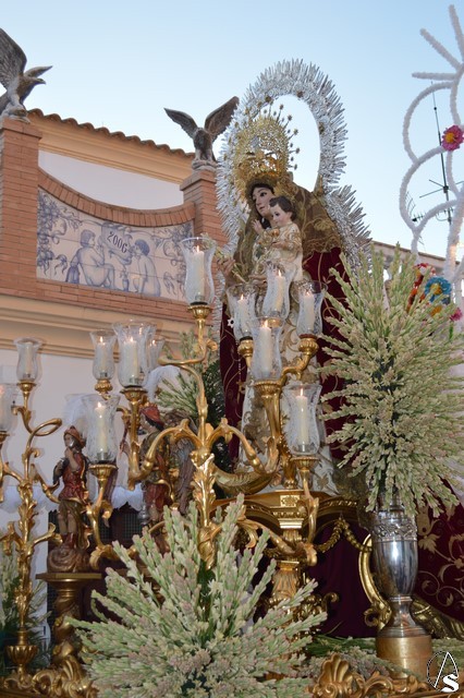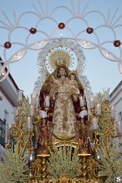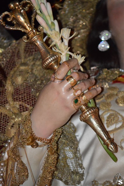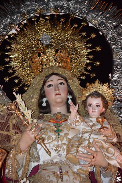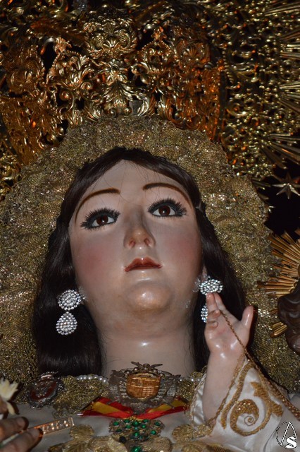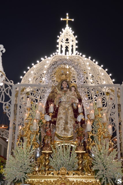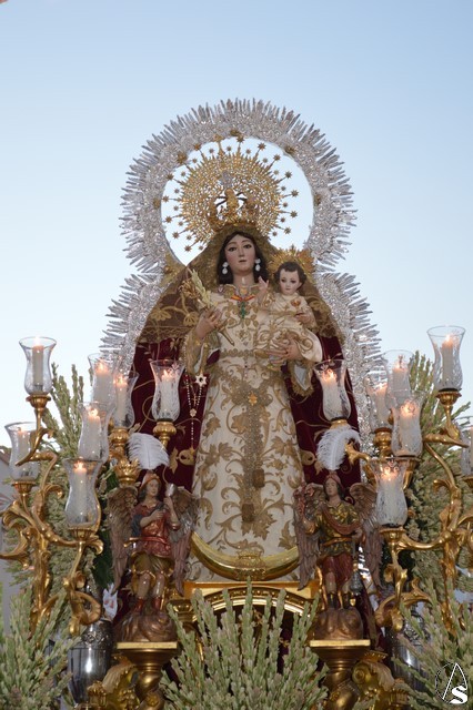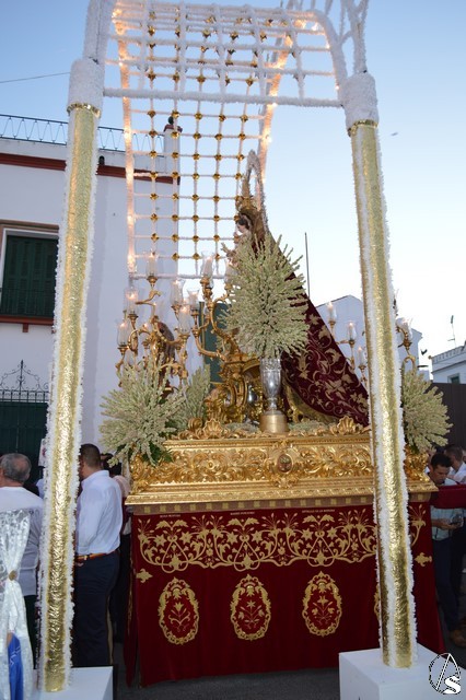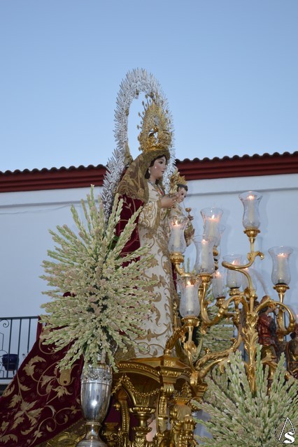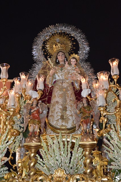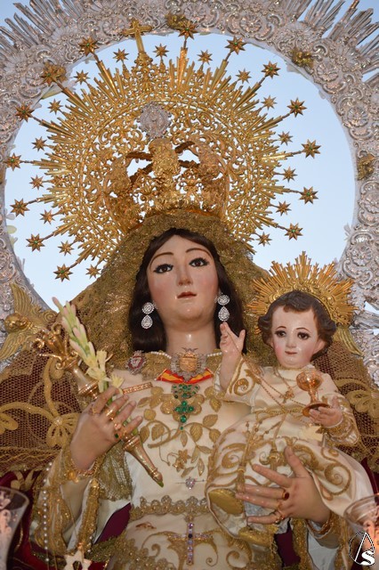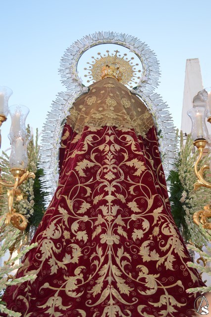 Lució la Virgen saya blanca bordada y manto de terciopelo rojo bordado. Sobre sus sienes portó corona de oro. En su mano izquierda sostuvo al Santísimo Niño que lució túnica blanca bordada, y en la mano derecha cetro de oro y un ramito de nardos, flor que exornó el paso de la Virgen. La imagen queda enmarcada en ráfaga de plata.