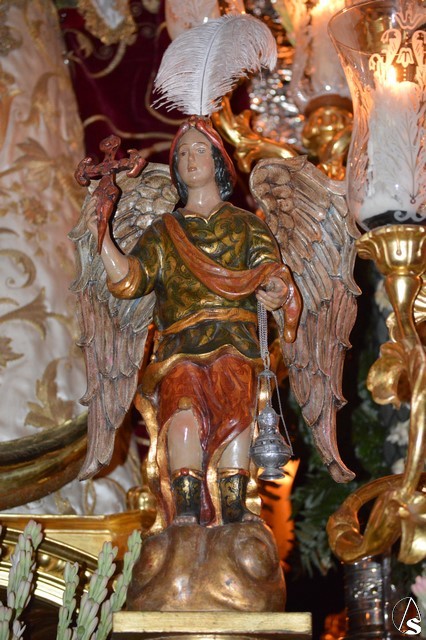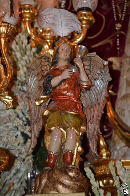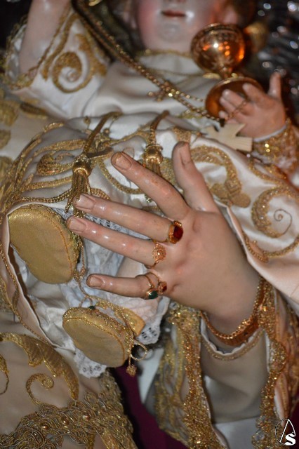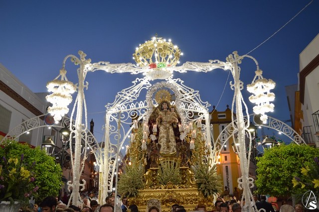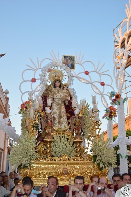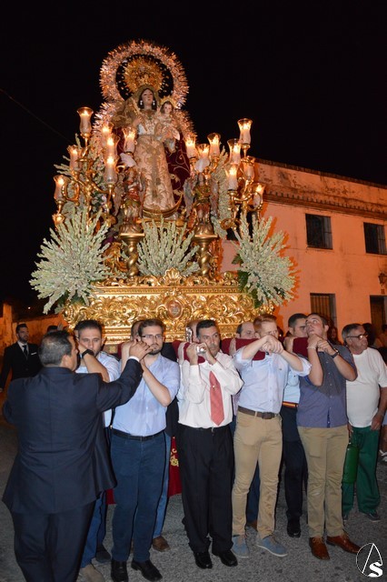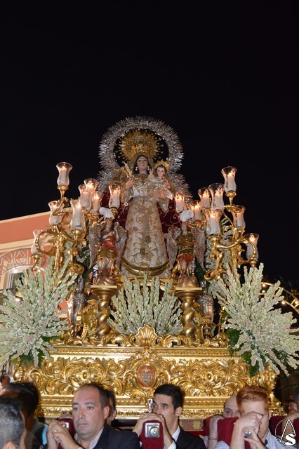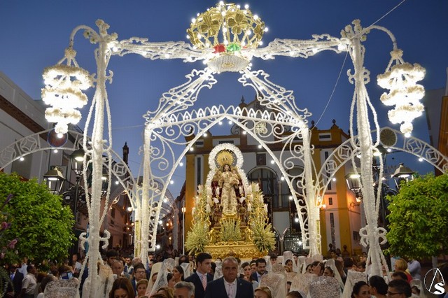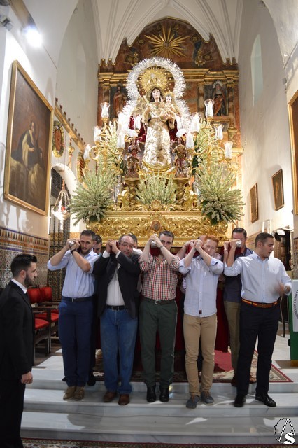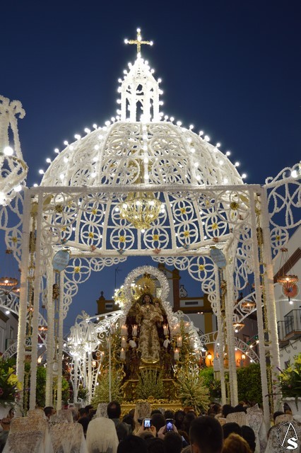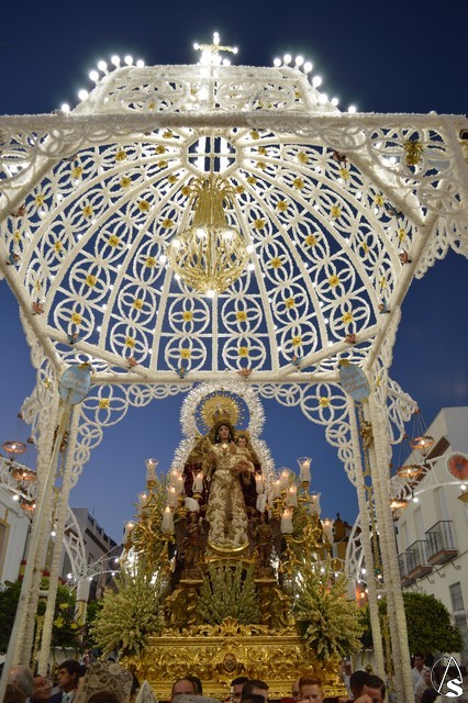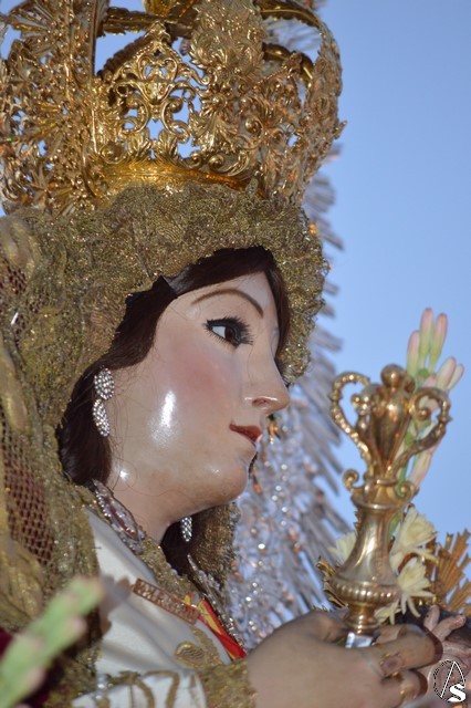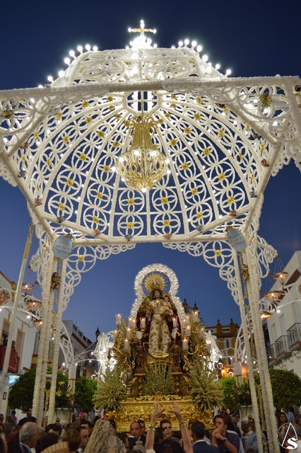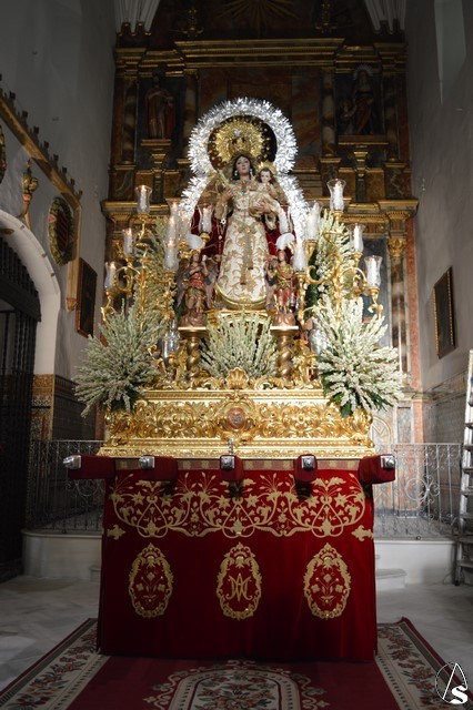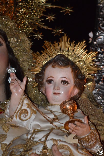 Lució la Virgen saya blanca bordada y manto de terciopelo rojo bordado. Sobre sus sienes portó corona de oro. En su mano izquierda sostuvo al Santísimo Niño que lució túnica blanca bordada, y en la mano derecha cetro de oro y un ramito de nardos, flor que exornó el paso de la Virgen. La imagen queda enmarcada en ráfaga de plata.