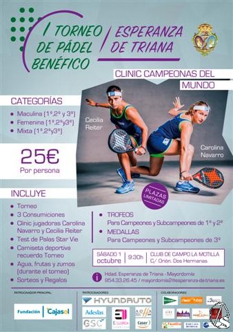 Arte Sacro. El 1 de octubre se celebrará, desde las 9.30h y durante toda la jornada, en el Club de Campo La Motilla (c/Orión s/n, La Motilla) el I torneo de padel benéfico Esperanza de Triana.