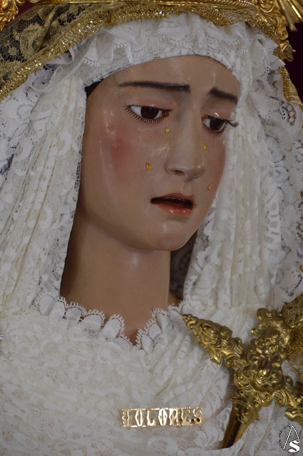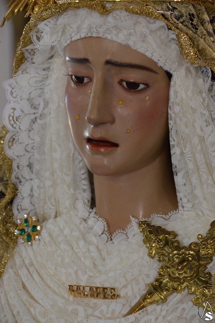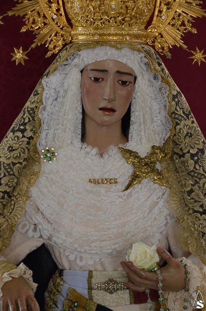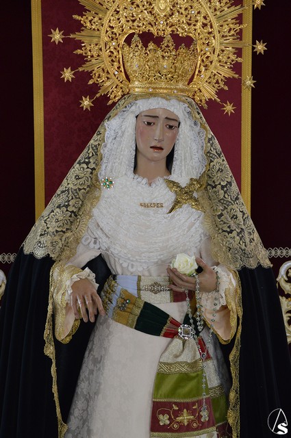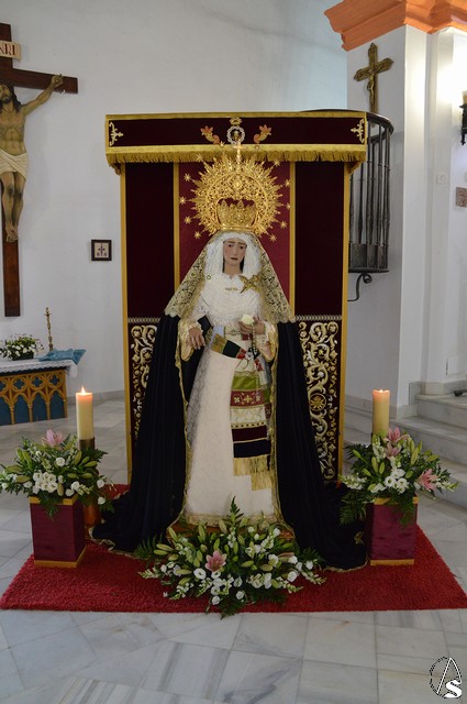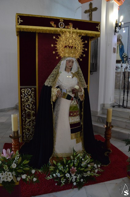 Fran Granado. El pasado domingo 18 de septiembre se ha celebrado en la Parroquia de Santiago el Mayor de la localidad sevillana de Villanueva del Río, el besamanos de Nuestra Señora de los Dolores. Dicho acto se ha celebrado tras la misa que daba comienzo a las 10:00 horas. La Virgen de los Dolores estrenó para dicho acto una saya confeccionada en damasco blanco roto, donada por un hermano.