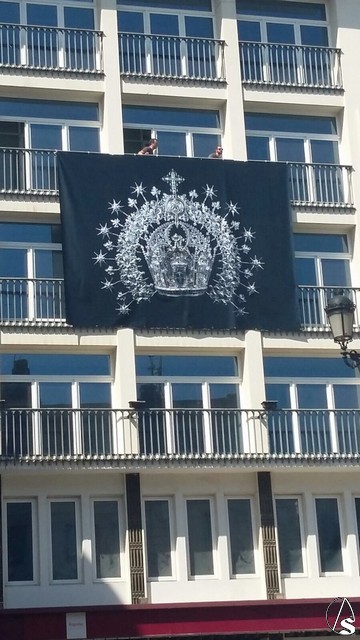 Durante el desayuno el mayordomo Manuel Recio recibió una llamada con la que se confirmaba que desde el día de ayer y hasta el próximo 2 de octubre, iba a quedar instalada en la fachada de la antigua sede del Banco de Andalucía de la avenida de la Constitución una gran lona de 42 metros cuadrados que reproduce sobre un fondo negro la corona de la Virgen y que ha estado presente en la exposición que la corporación del Domingo de Ramos organizó recientemente con motivo de los actos previos a la coronación de la titular en el Real Círculo de Labradores.