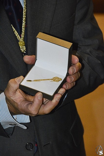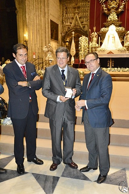 Al finalizar los cultos del primer día del triduo, Miguel Osuna, hermano mayor de la hermandad de la O, hizo entrega de un alfiler de recuerdo de la Hermandad de la O al hermano mayor de la hermandad de La Paz, Santiago Arenado, que le agradeció el detalle.