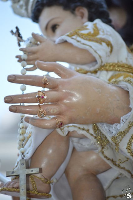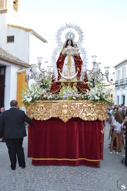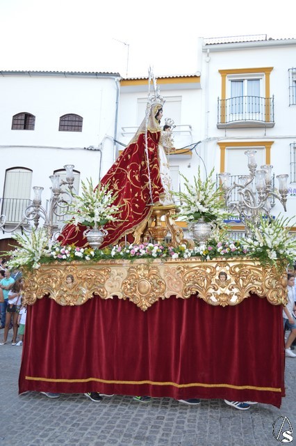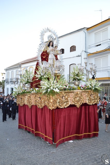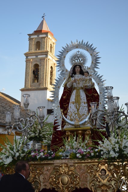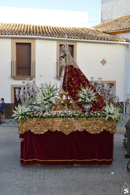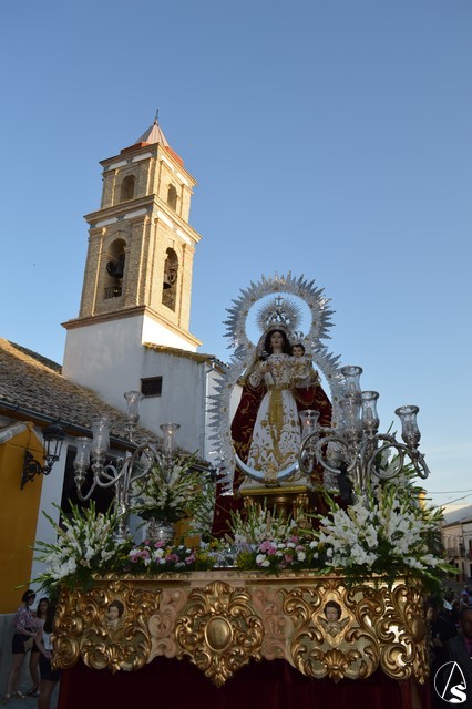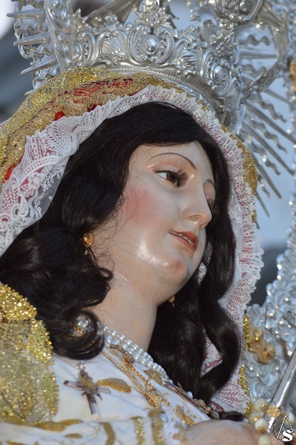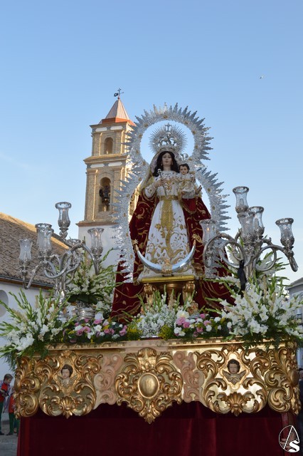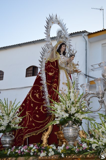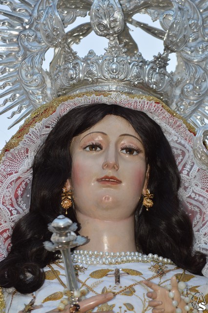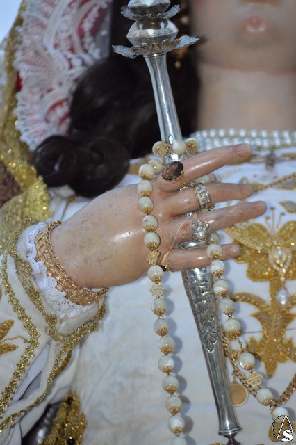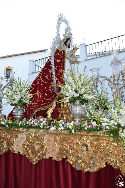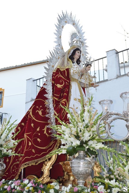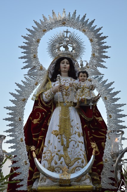 La Virgen del Rosario procesiona sobre paso con respiraderos de madera dorada y alumbrada por cuatro candelabros de guardabrisas de plata en las esquinas. El paso estuvo exornado con flores blancas tanto en la parihuela como en las jarras de plata.