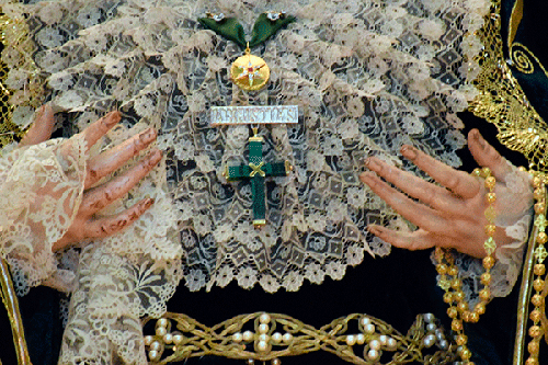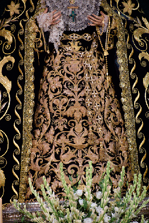 La Virgen estrena para tal efemeride, un manto bordado en oro con manguitos también bordado a juego con la saya que se confeccionó en terciopelo verde oscuro por el taller de Juan Manuel Rodríguez Ojeda en 1909 y que procesiona todos los Jueves Santo. También estrena una toca de sobre manto restaurada y enriquecida con hilo de oro tejido a mano en el taller de bordado de Mariano Martín Santoja de Sevilla y un guarda pelo restaurado en oro que se lo regaló el torero Antonio Reverte Jimenez a la Virgen de las Angustias con una foto del diestro y la Santisima Virgen y pelo de la cabellera de la titular mariana de la corporación del Jueves Santo, entre otros estrenos.